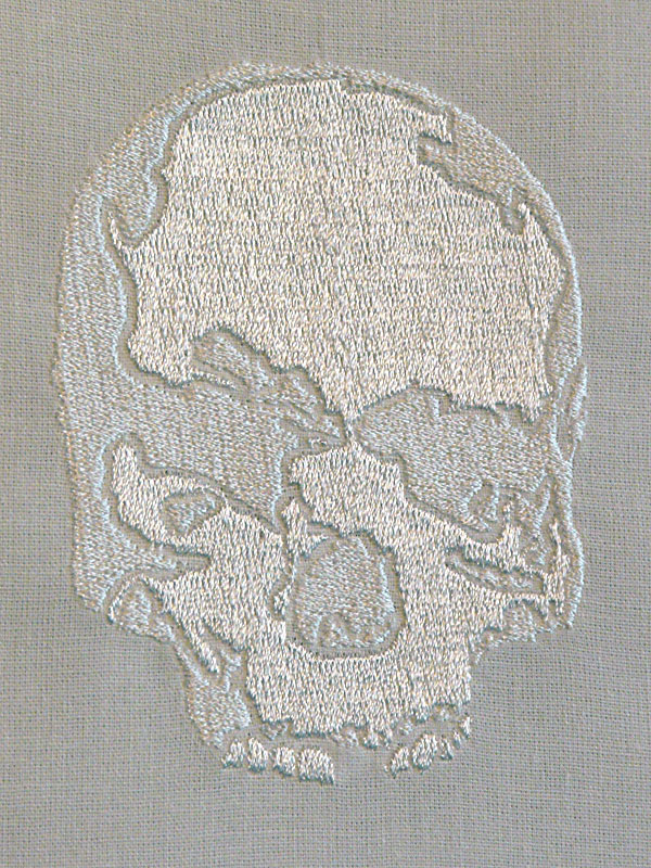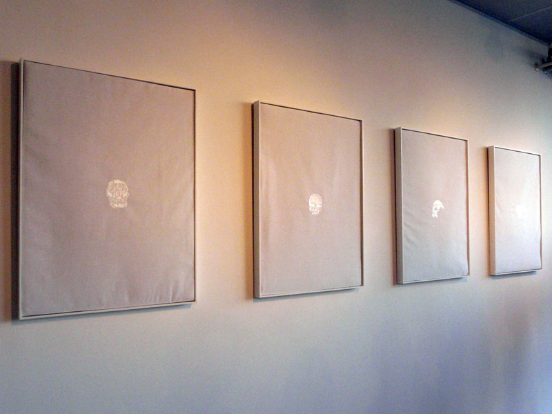 (A propos de l'oeuvre Crânes) "Il y a trois blancs différents sur ces quatre toiles. Ici le blanc signifie la pureté, l'idée du vide et du néant. On a encore l'apparition du blanc et de l'éphémère. Elle a voulu chercher une technique pour mettre en avant ce qu'elle ressent par le biais du fil blanc cousu dans les deux sens pour chercher à préciser sa pensée."