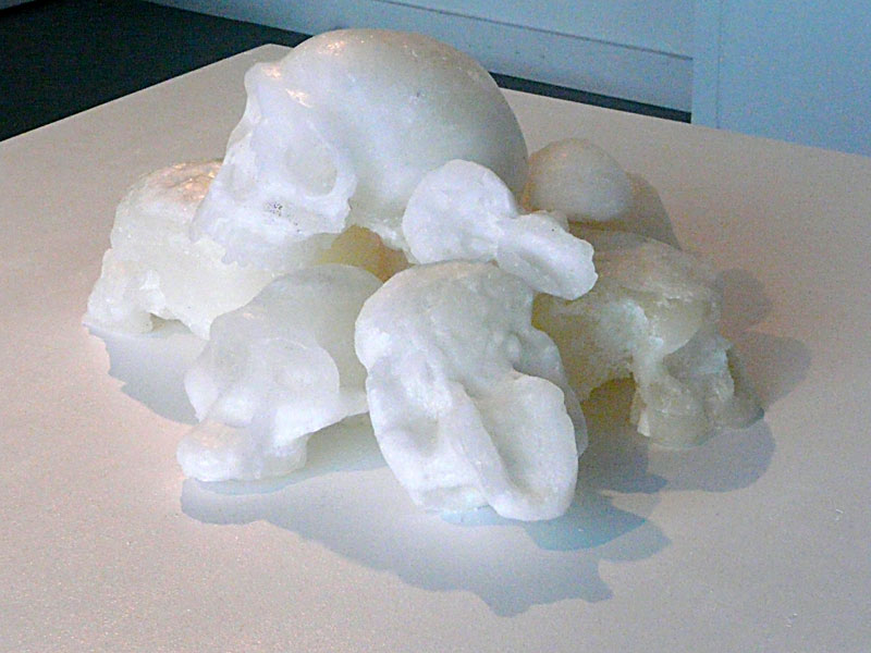 (A propos de l'oeuvre Memento mori) "La matière utilisée a été la cire, ce qui accentue le fait de la vanité, puisque la cire fond au fil du temps pour être détruite, consumée. Elle va disparaître comme nous qui vivons et mourons. Quelque part, faire un moule de crânes anciens pourrait nous laisser croire qu'on voudrait préserver ce qui reste de nous pour une autre forme qui finira à son tour elle aussi par être détruite et disparaître. Une bougie, de la cire, ne font pas peur à toucher, mais le fait que ce soient des crânes huamains et ds crânes d'animaux, cela peut nous paraître un peu étrange."