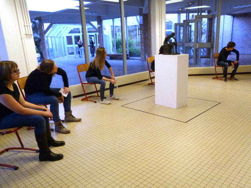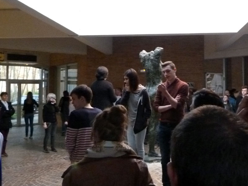 la saynète la plus poignante eut lieu autour de la statue, emblème du lycée, à travers l'interprétation du groupe entier, fonctionnant comme un écho, d'un texte fort et particulièrement émouvant.