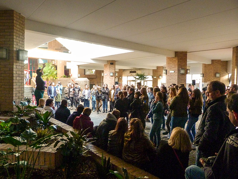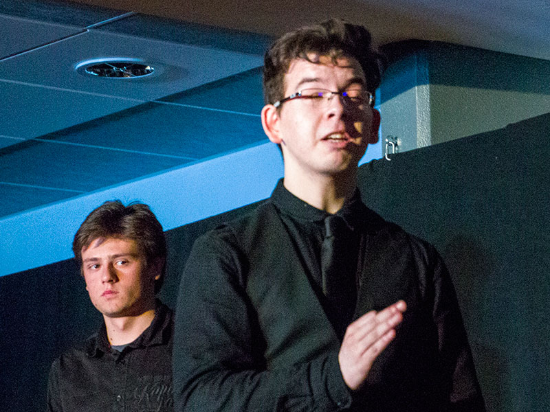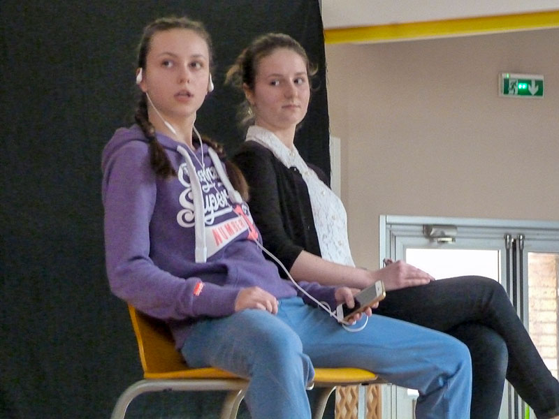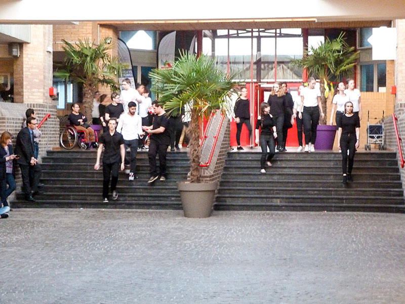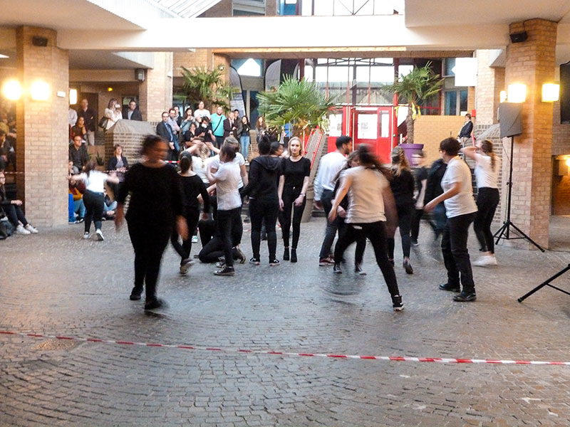 Durant la seconde partie du programme dans la salle d'accueil les interventions des différentes sections arts ont enchaîné courts-métrages du cinéma-audiovisuel, chansons de la section musique et scènes des élèves de l'option théatre.