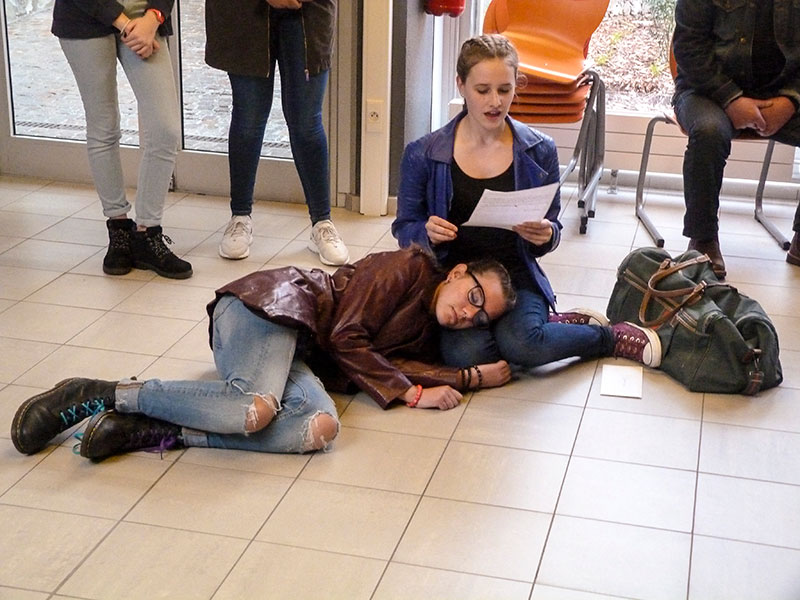 Melle Croquefer, professeur de théâtre proposait une déambulation à travers différentes scènes : découverte d'extraits de textes de Matéi Visniec, Migraaaants.