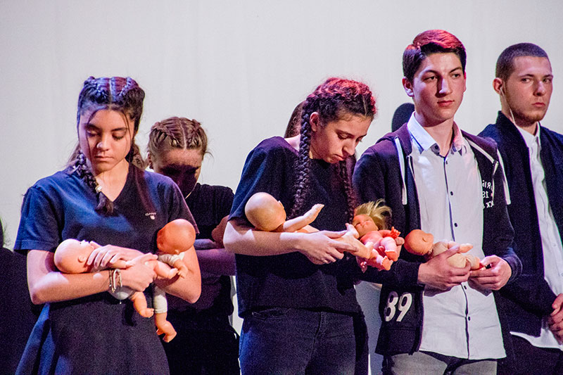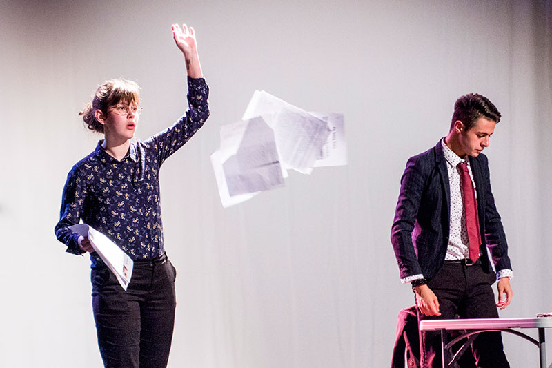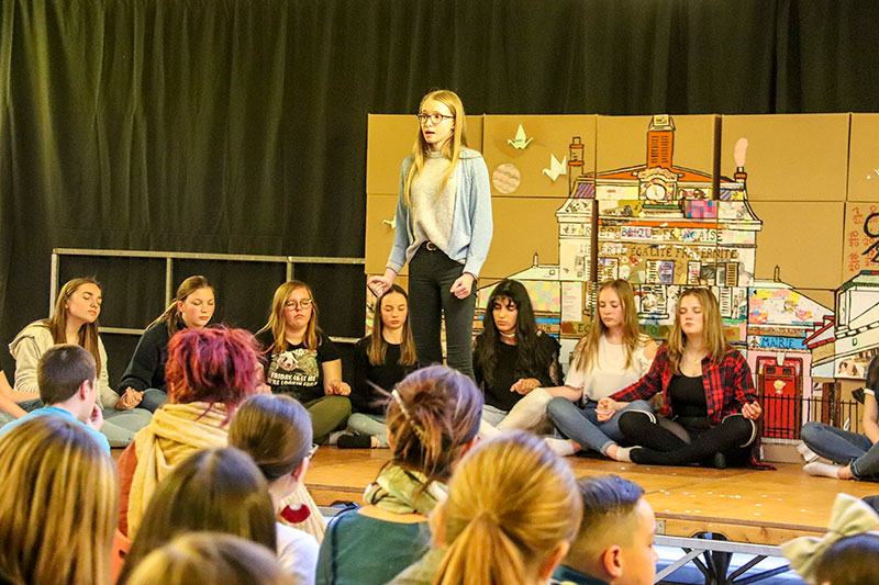 Les élèves de seconde d'option théâtre ont joué des textes tirés de l'oeuvre de Sylvain Levey Cent culottes et sans papiers encadrés par leur professeur M. Sorriaux et le comédien intervenant, Tony Honvault. Par ailleurs les élèves de seconde de l'option facultative arts plastiques, ainsi que quelques élèves du Collège du Moulin, ont contribué à la construction du décor de la pièce.