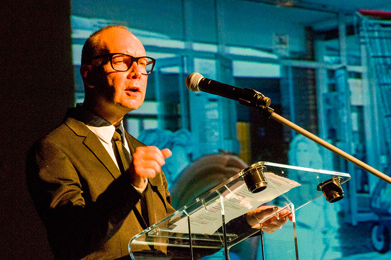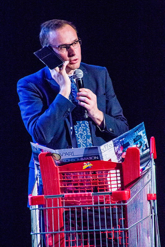 Le fil conducteur de cette scénographie était tenu par le personnage de M. Déloyal, conférencier, spécialisé dans les circuits économiques, dont le discours, d'abord pétri de certitudes, était quelque peu mis à mal par la relecture critique proposée par les différents tableaux du spectacle.